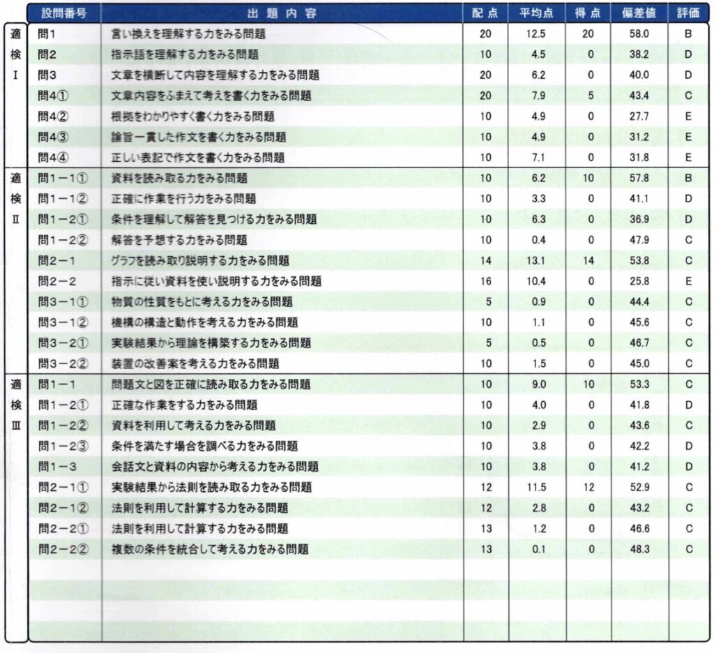 なかなかわかりにくいけど、読み取りはできている感じかな。説明とか、書くことが全てEになっているので、記述系が苦手な感じだ。これは国語で苦労するのかな。
