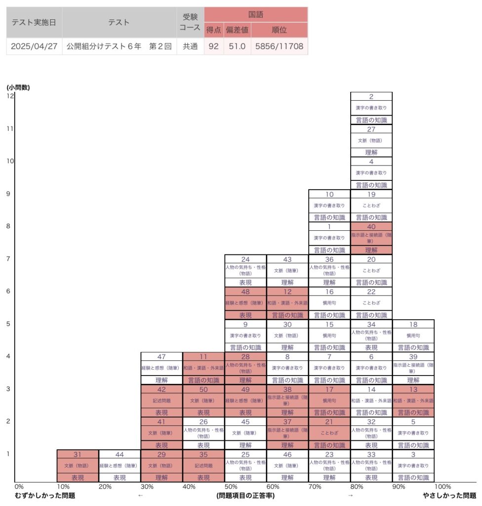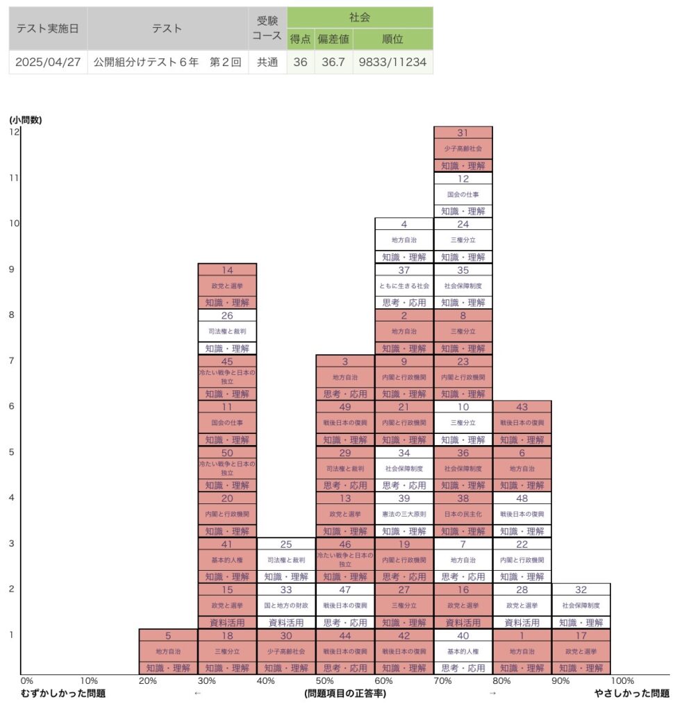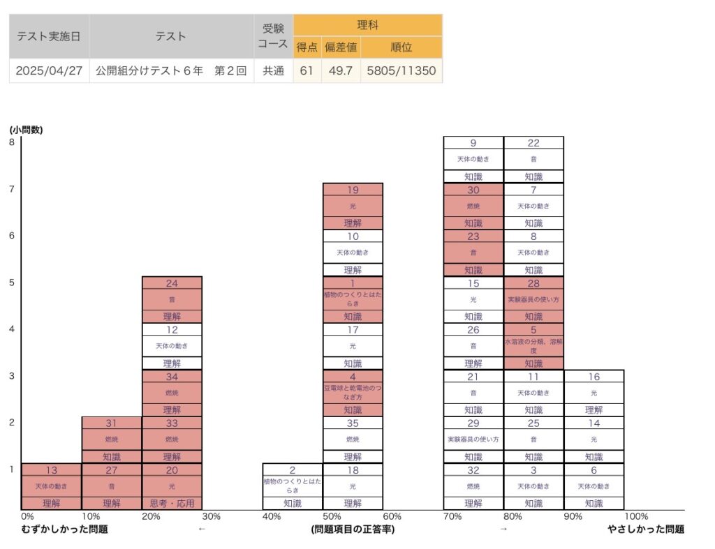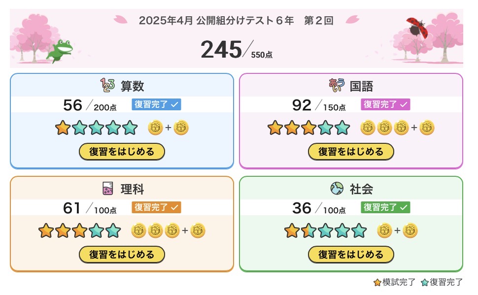 算数は流石に厳しかったかな。わかっていたことだ。ただ中学受験において算数は武器だ。アドバンテージが取れる科目だ。重点的に実力をつけていこう。なに大丈夫だ。やってなくてできないだけだから、できるなるようにやればいいだけだ。国語は、まずまず戦えているのか文章を読むことはある程度できるようだ。ただ、圧倒的に語彙が足りないので文章が理解できないことがあったり、基礎的な語彙の問題で落とす感じ。理科はだいぶ頑張れたか。できたところとできなかったところを書き出しておこう。社会は公民分野が多く出ていたのだろう。流石に間に合わなかった。大丈夫。これからだ。効率の良い暗記ですぐに追いつかせてやる。今はaクラスで負荷のかからない場所で、実力を蓄えていこう。まぁ、まだクラス分けは分からないけど流石にaクラスだろう。まぁ願ってもない。今まぐれあたりで上に上がっても適正のレベルではないから、効率が落ちる。今はaクラスが最適解だ。