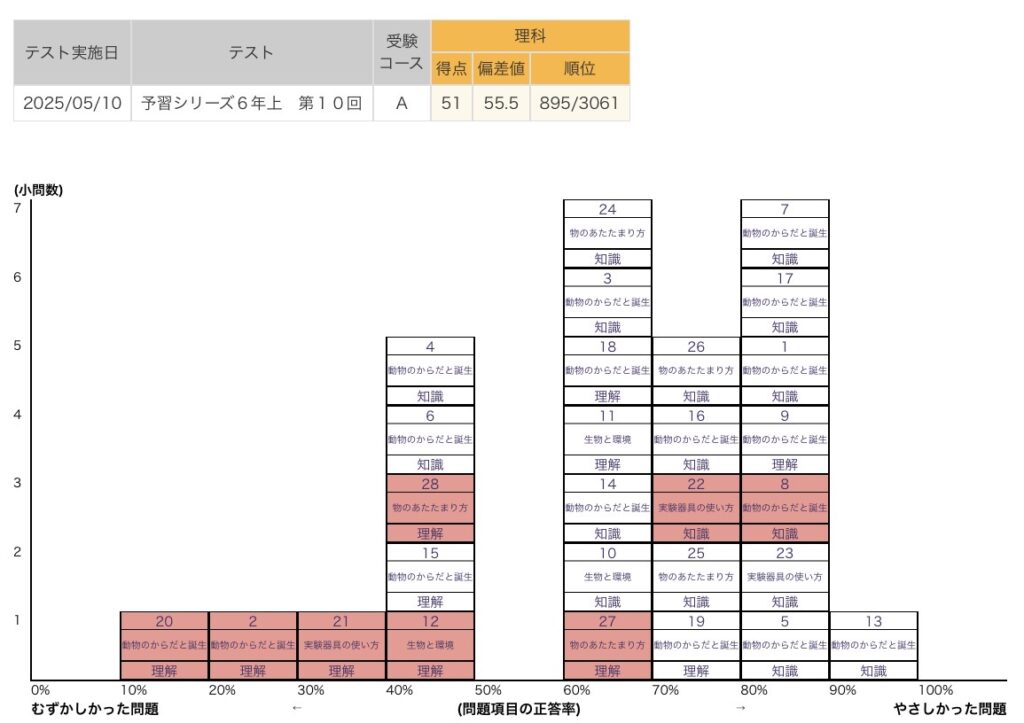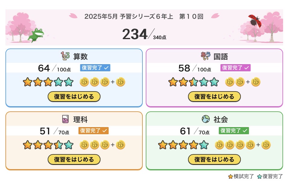 算数は6割。欲を言えばもう少しだが、しっかり基礎はとってきた感じの点数だ。国語は6割弱。いまいちか。理科と社会は7割オーバー。よくできている気がする。やはり、単元が決まっている暗記科目は得意みたいだ。イメージ記憶が上手く使えているか。社会なんて後少しで満点だ。