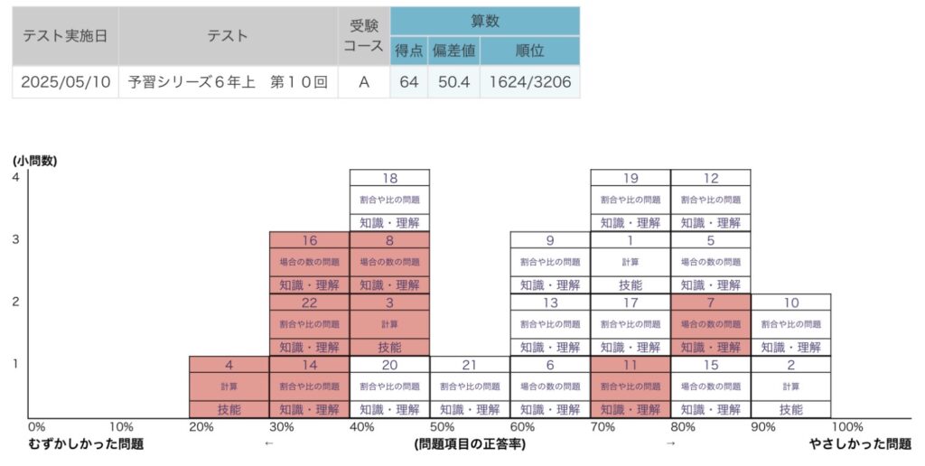 正解率が高いところで場合の数の1行問題で間違えている。場合の数は苦手範囲のようだ。今回でしばらく週テストには出てこないかもしれない。できれば夏休み前に一度原田式から見直したい。時間がないかもしれないが。