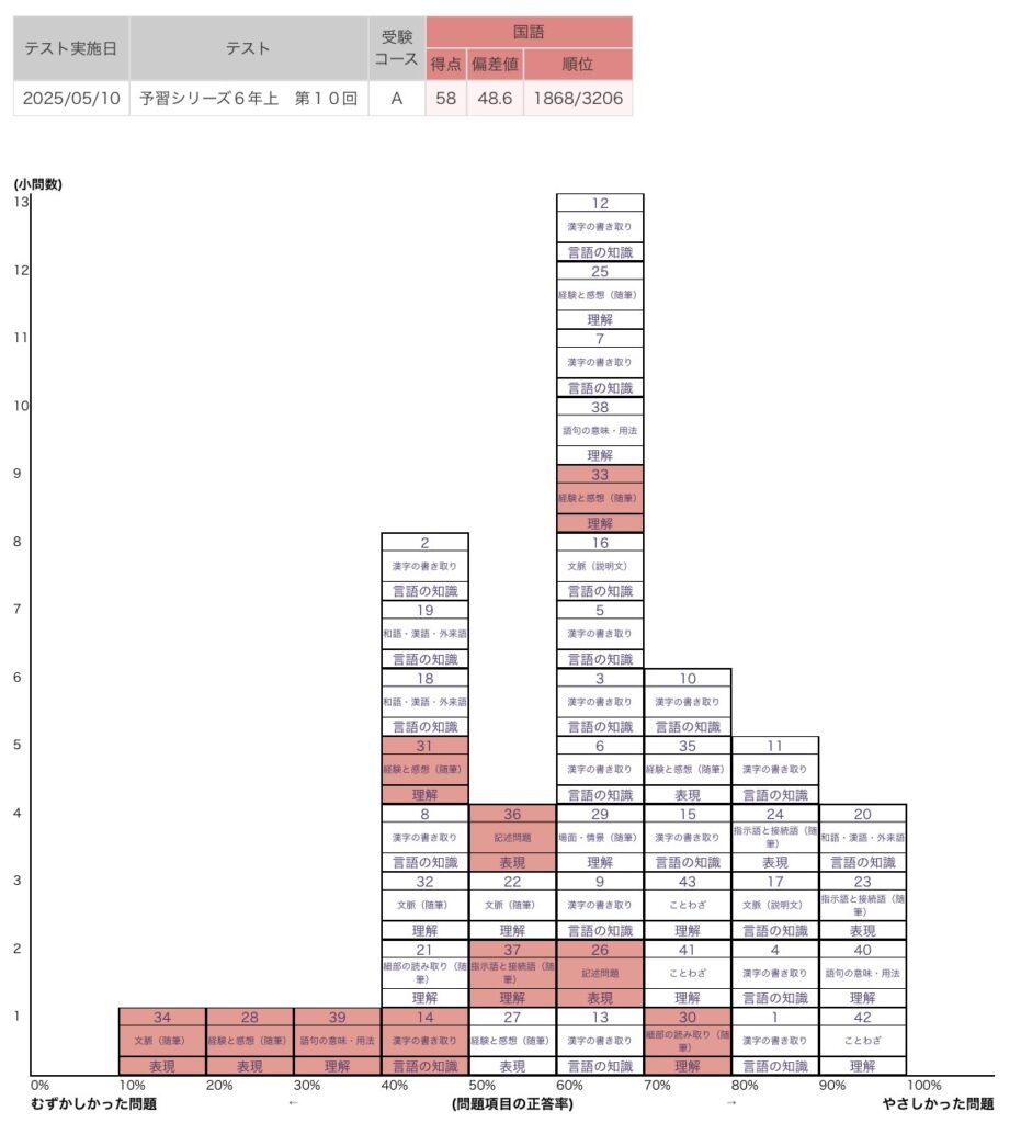 国語は読解の見直しが難しいので、授業とかでお願いするしかない。今のところ、家でできることは漢字と語彙である。漢字は2問、語彙は1問間違えているが割と正解率は低い。