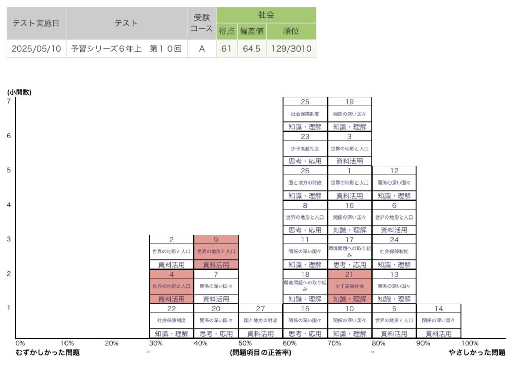 一応テストの分析を軽くすると少子高齢化の地域問題を間違えている。正解率は高いところだから、覚えないといけない言葉。あとは資料の見方か。社会ではよく出る形式だ。入試の問題はこれよりはるかに難しくなっているが、似たような問題だ。まずは理科と同じで基礎知識の定着。そして社会は流れと意味を覚えて理解していかないといけない。一問一答形式の問題は入試では減ってきている。理由や考察を問う問題が多くなってきているからだ。