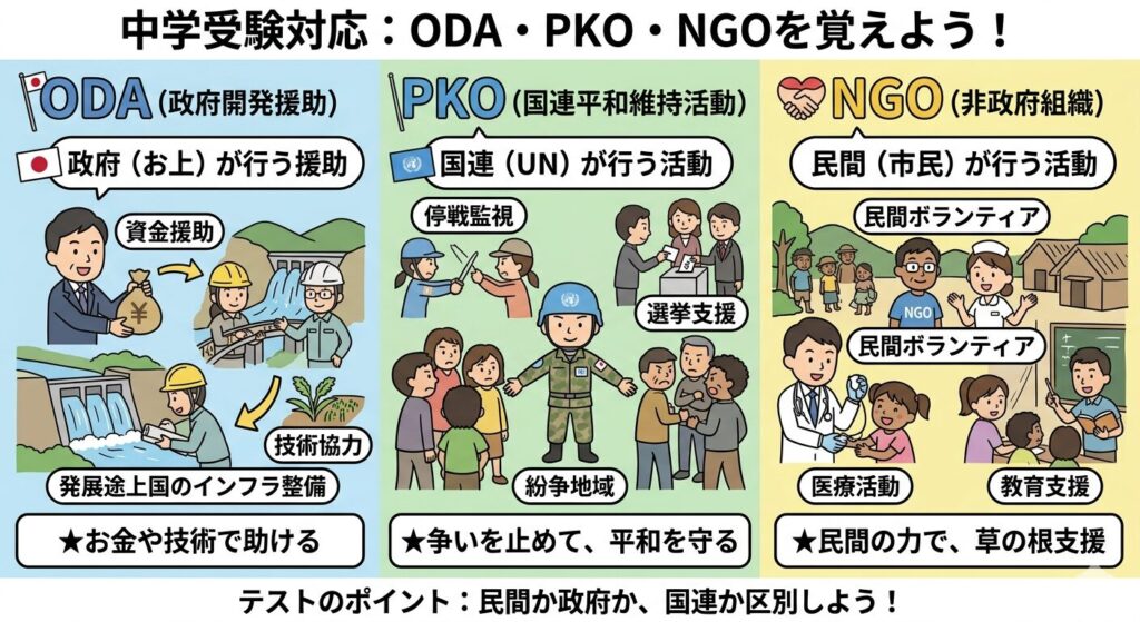 - アルファベット略称は「クイズ形式」で定着させる 「ODA」「PKO」「NGO」や、国連機関の「UNESCO」「UNICEF」などは、子どもにとって単なる記号に見えがちです。「世界遺産を決めているのは?」「自衛隊が行くのは?」など、日常的にクイズを出してあげると楽しく覚えられます。