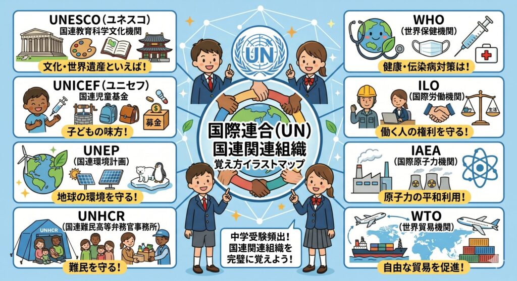 この単元は、現代の国際社会のルールや、ニュースでよく耳にするアルファベットの略称(WHO、UNESCOなど)がたくさん登場します。公民・時事問題に直結する非常に重要な単元です。