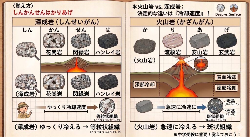 - ※有名な語呂合わせ(例:「リカちゃん、あせってゲロはいた」「新幹線はかりあげ」など)を使って、組織・岩石名・色(白っぽいか黒っぽいか)の表を丸ごと書けるようにするのがベストです。