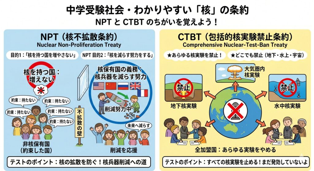 - 核兵器をこれ以上増やさないためのNPT(核拡散防止条約)も重要用語です。