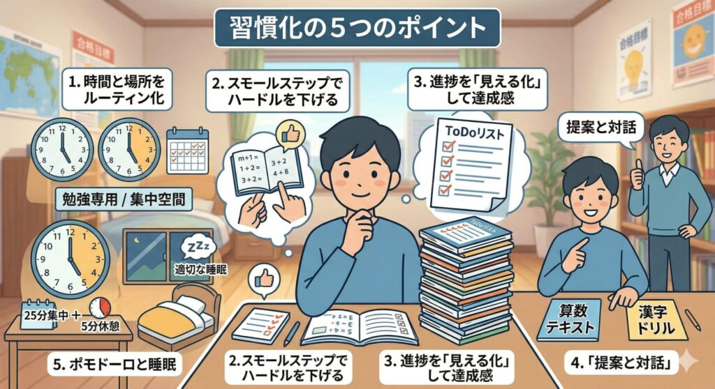 勉強を「特別なこと」ではなく、歯磨きのような「当たり前の習慣」にするための重要なコツを5つのポイントで整理しました。