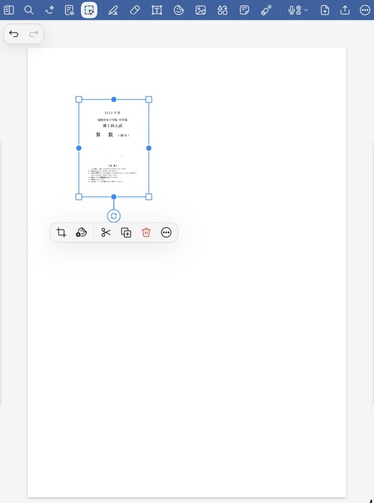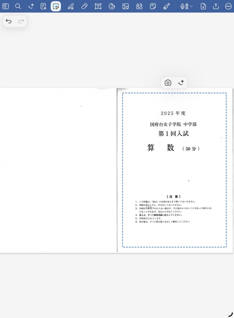 まず1ページにしたいサイズの用紙を追加します。A4とかですかね。小冊子のサイズです。Goodnotesは下地が白色と黄色があるので、白色にします。印刷が楽なのと綺麗です。そしたら、見開きになっているページを片方、投げ縄ツールで切り取ります。スクリーンショットを撮るような形になると思います。