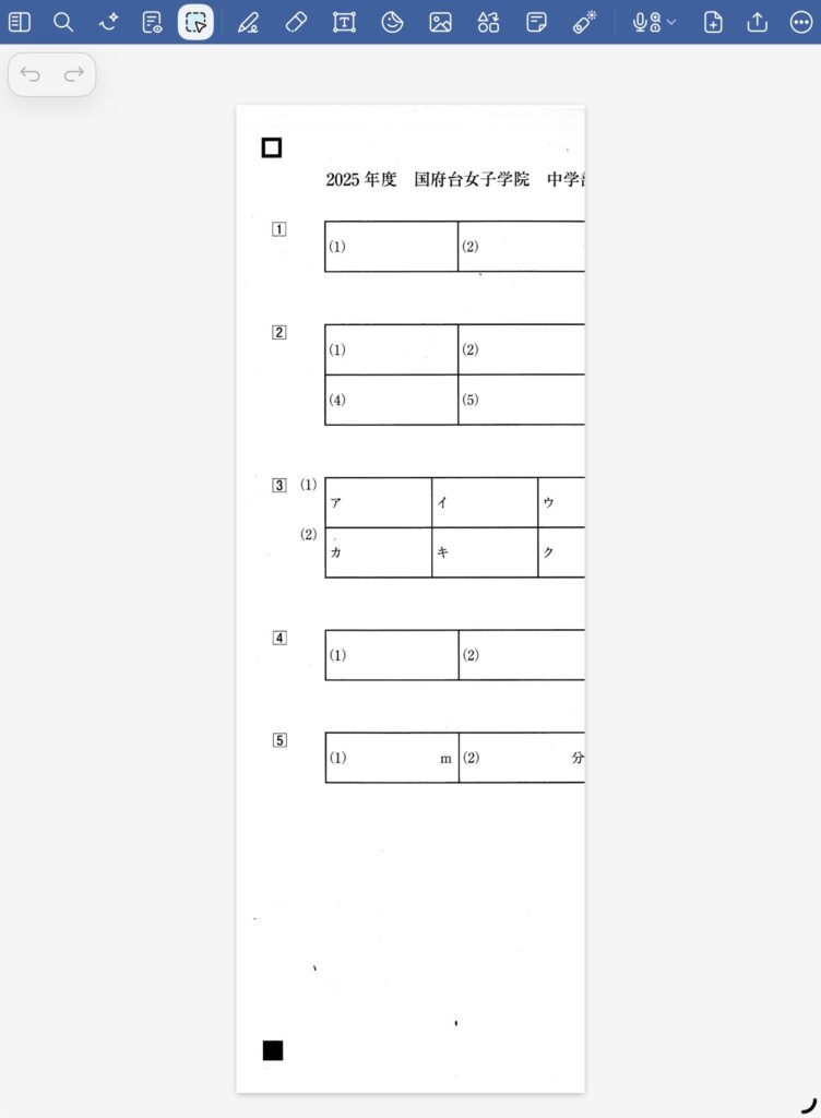 WEBでPDFを左右に分割と検索すると出てくるサービスを利用する方法です。色々とリスクもあるのですが、わかっている人は問題ないかと思います。まぁ自己責任で。これだと、一気に左右に分割してくれます。解答用紙も入っていると以下のようになりますので、事前にGoodnotesで別のページに保存しておくといいでしょう。